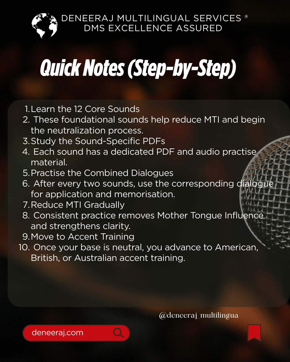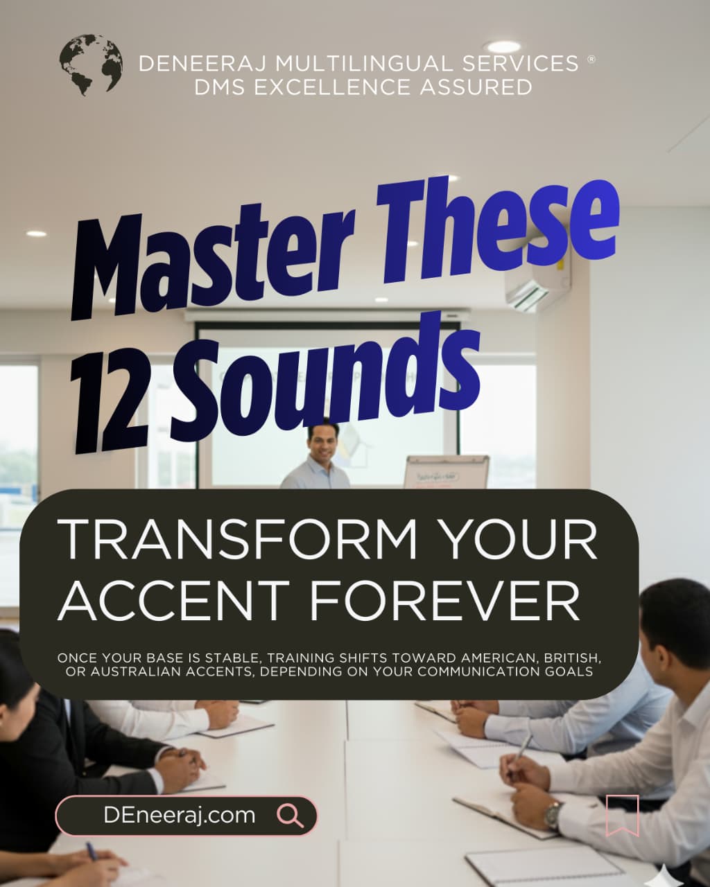 Every clear, confident, professional-sounding voice begins with one thing: structure. Accent training does not start with copying an accent — it starts with building the right foundation. At DMS Learning, that foundation is built through the 12 Core Sounds, a scientifically designed method that gradually removes Mother Tongue Influence (MTI) and replaces it with clean, neutral, globally understandable speech. This method is not about sounding foreign or artificial. It’s about sounding clear, confident, and globally ready.
